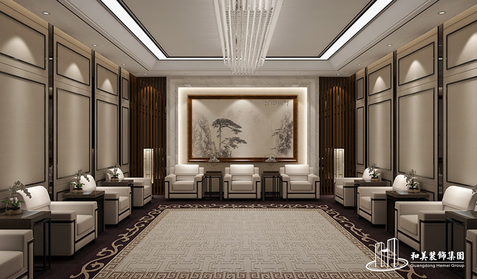 设计理念:本案例采用的是现代风格,前台使用了大量的大理石元素,加上大吊灯,尽显办公空间的奢华,接待室是雍容华贵的中式风,风格大气上档次,让与会者产生一种被尊重感。