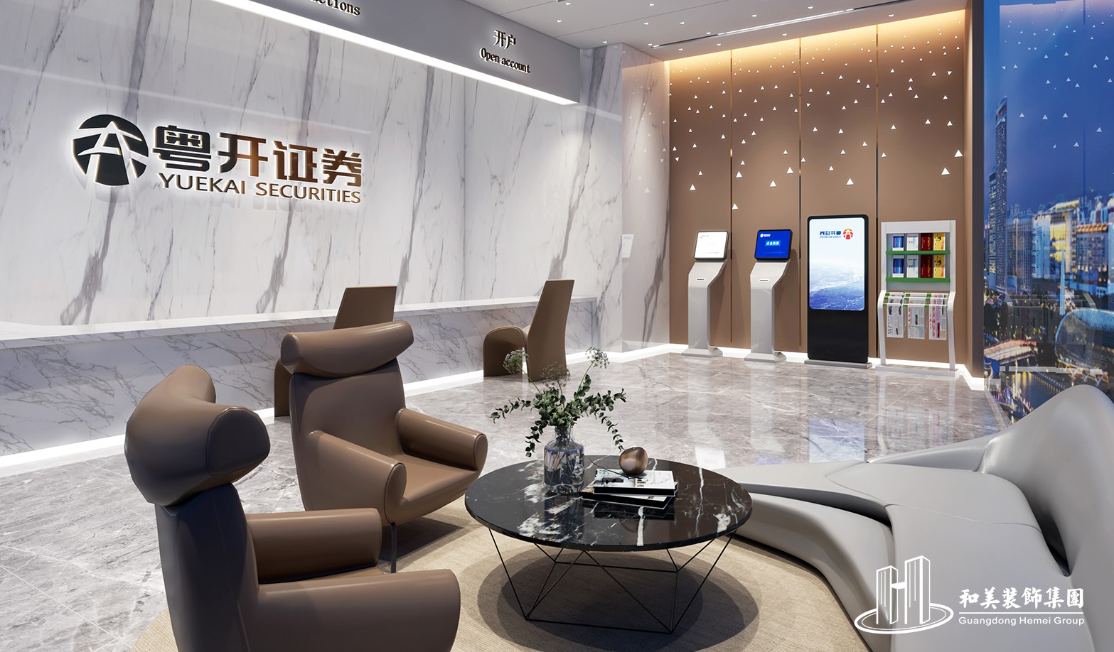 设计理念:本案例是粤开证券在广州黄埔开发区的营业厅办公室设计项目,对于营业厅办公室装饰设计来说,一个好的设计创意殊为不易,