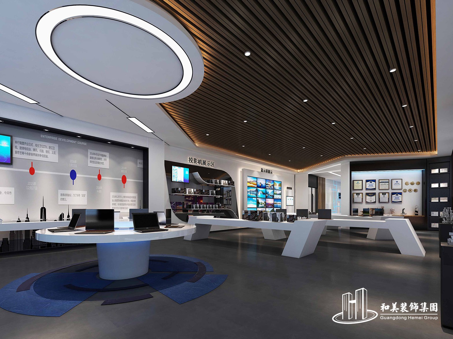 设计理念:本案例业主是做电子产品的,所以在本次的设计风格以现代、科技风为主,空间内的多个展区功能分明,动线明确,让来到这里的每位客户都满载而归。