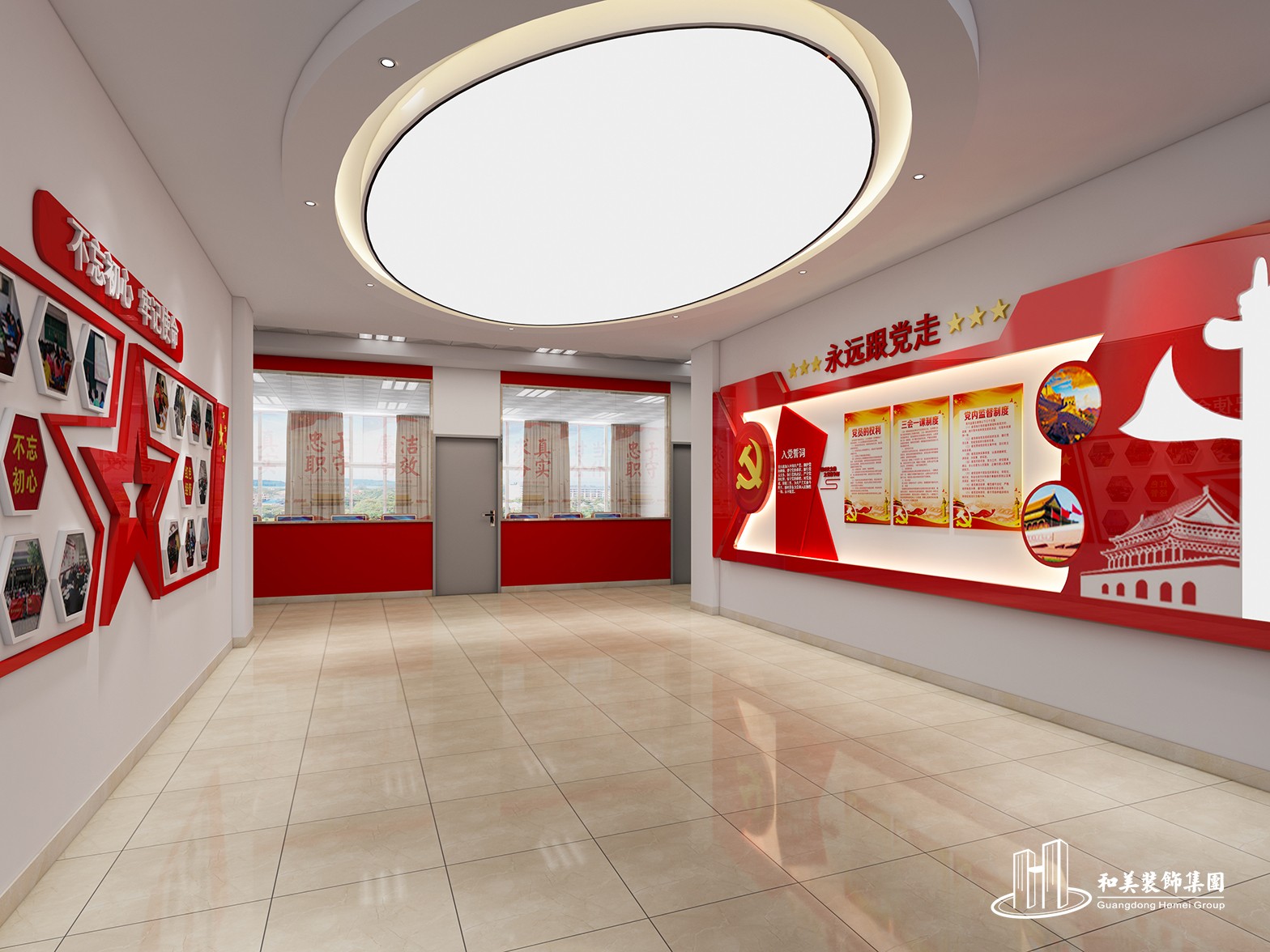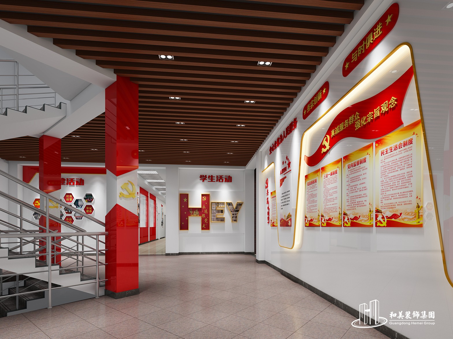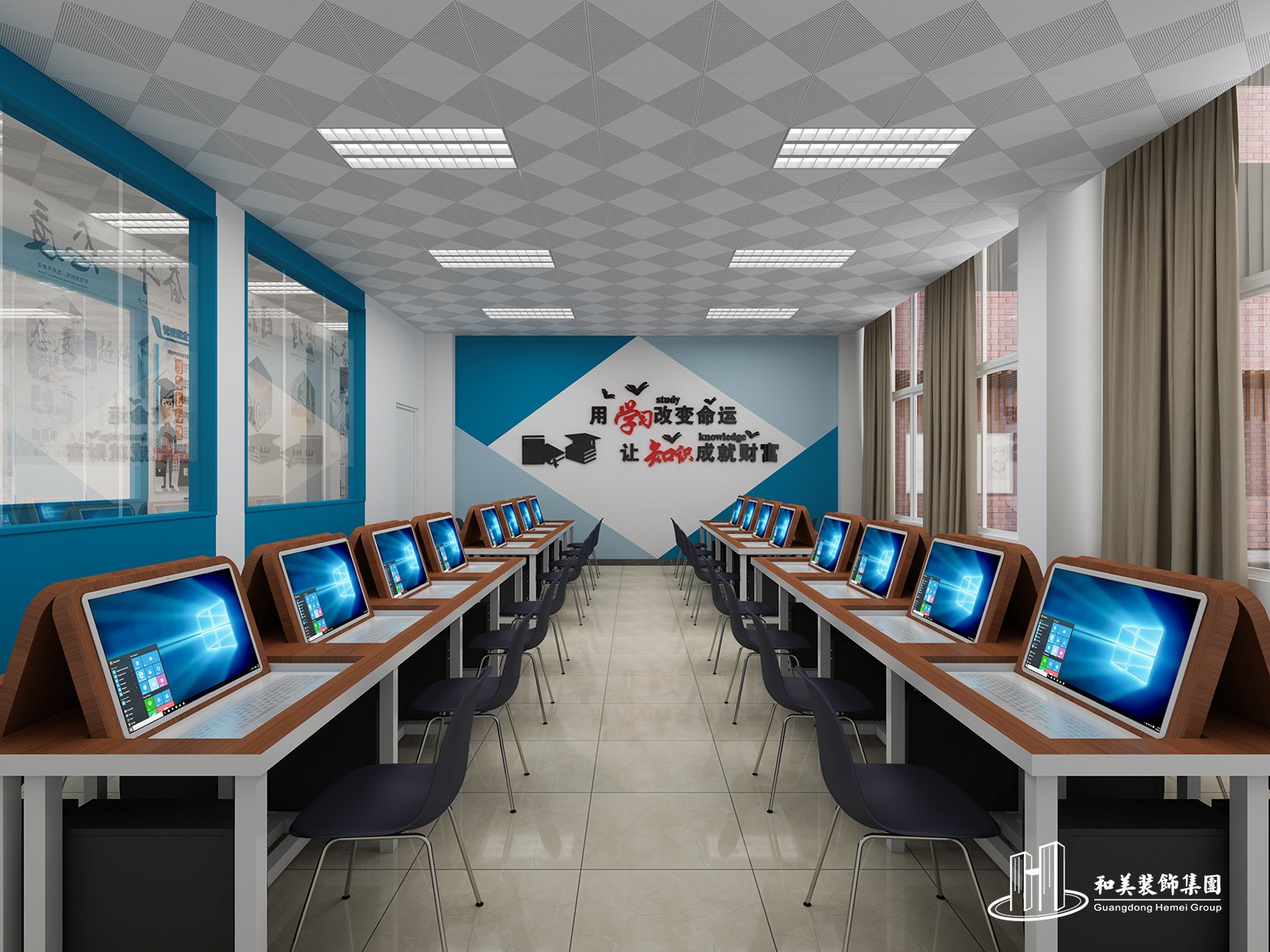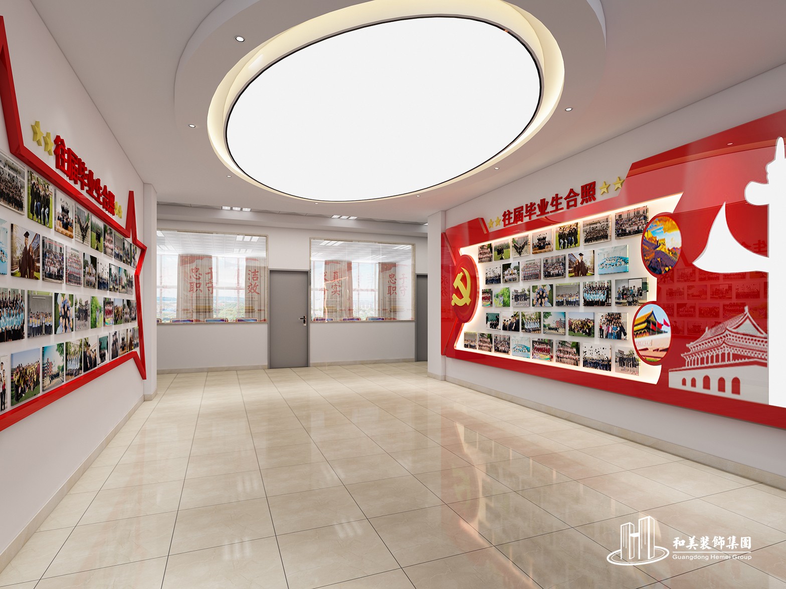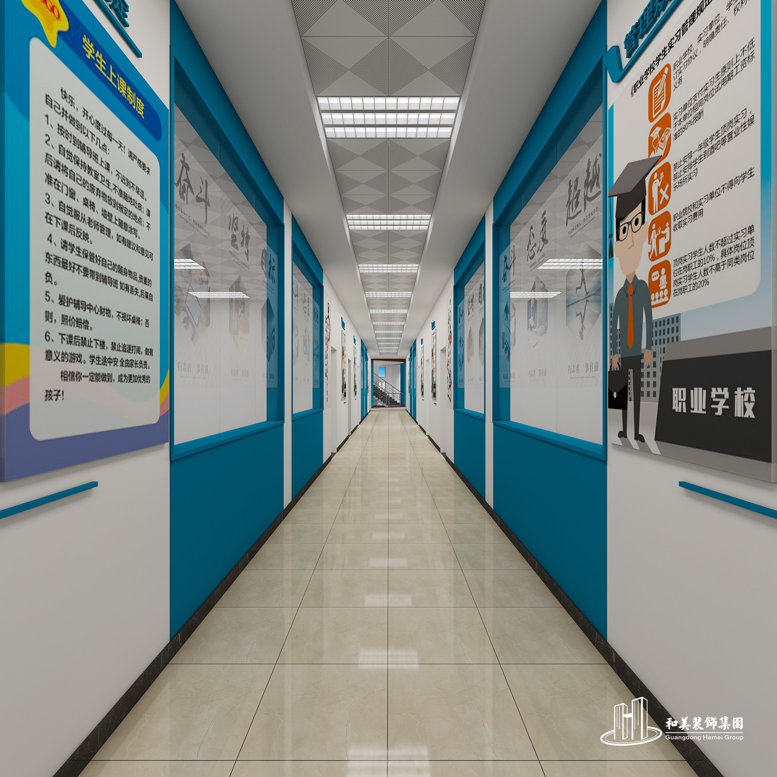 设计理念:本案例是高等院校的实训基地环境布置项目,室内设计风格以现代为主,主要展示财经学院的历程、毕业生情况、学生活动情况等等,是标准化的院校装修方案。