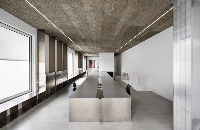--常规的办公室装修设计都会选用板材或者木材作为主要材料,今天,小美给大家分享一家设计很特别的办公室,它就是位于柏林市中心的BAM办公室,主要选用的材料有金属、铝和水泥,就连办公家具也选用铝材质,那我们就赶快来看看这家金属感设计的办公室吧!