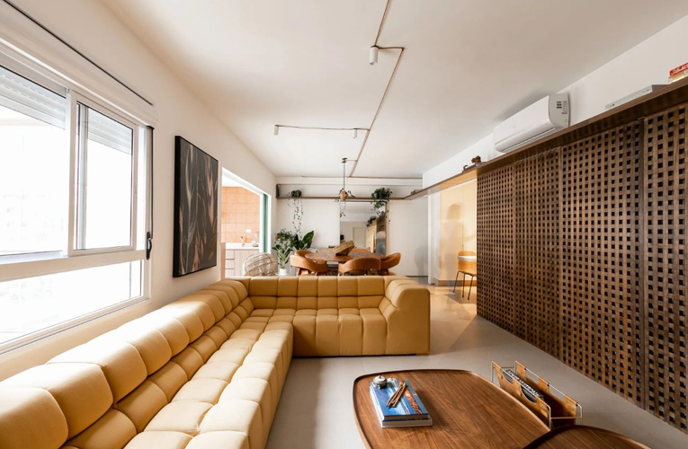 --如果你有套1102的房子,会选择怎么布置?打造成三房两厅或是两房一厅?许多人在空间划分上会更加注重卧室的数量,客厅的大小,以家庭人数来进行空间规划。今天,小美就给大家介绍位于圣保罗中心位置的住宅—Apartment AM ,屋主是一对年轻夫妇,因朋友和年迈老人经常到家做客,为了与他们无障碍沟通,以及营造一个宽敞的空间。设计师最终选择以天然材质的家具装点室内,并通过功能区的划分带来趣味感。