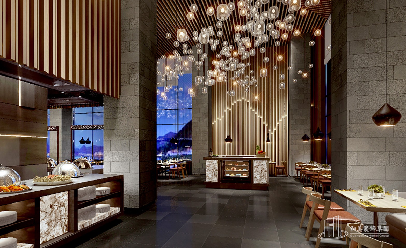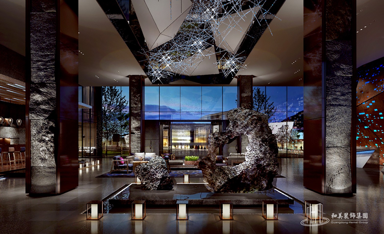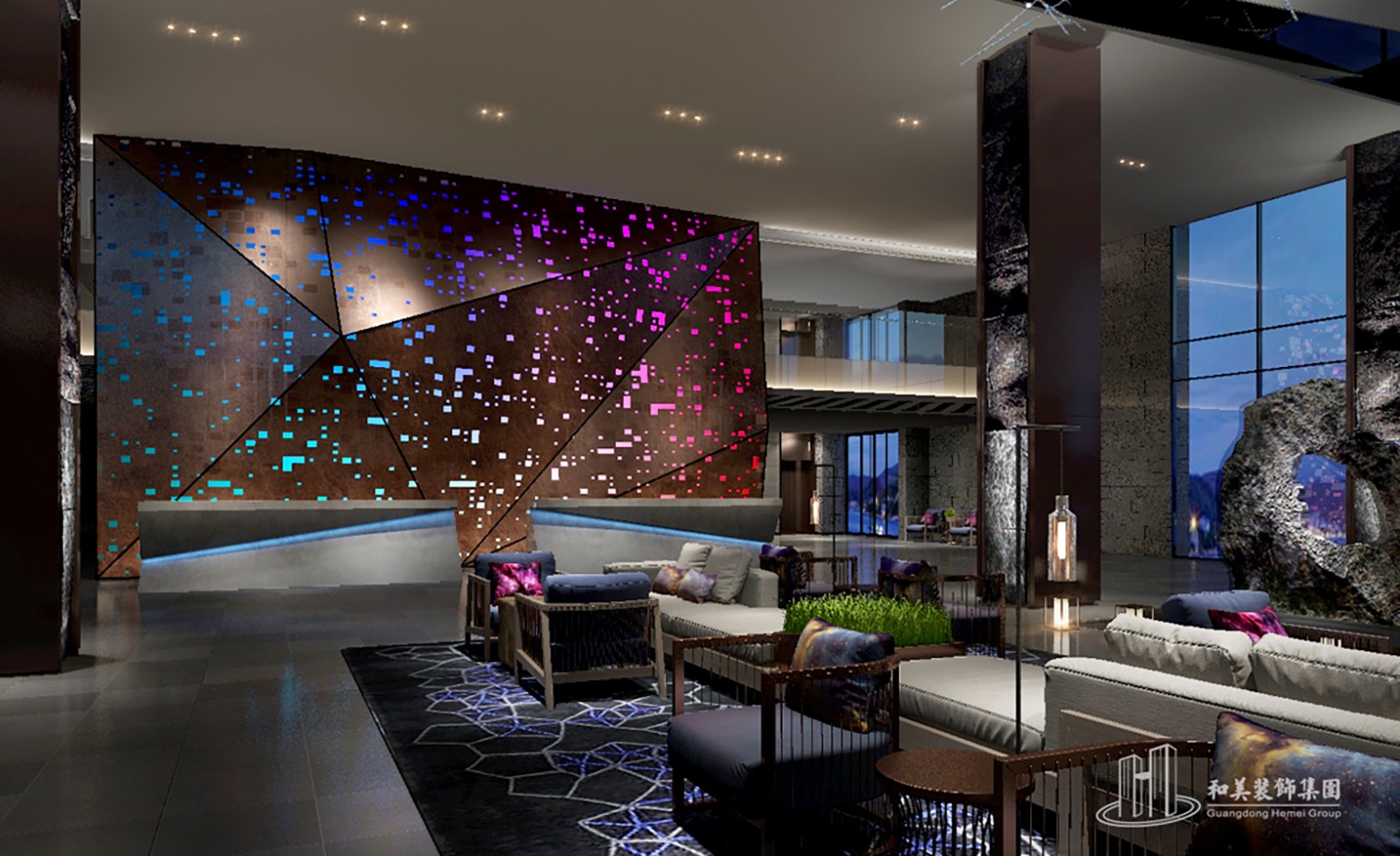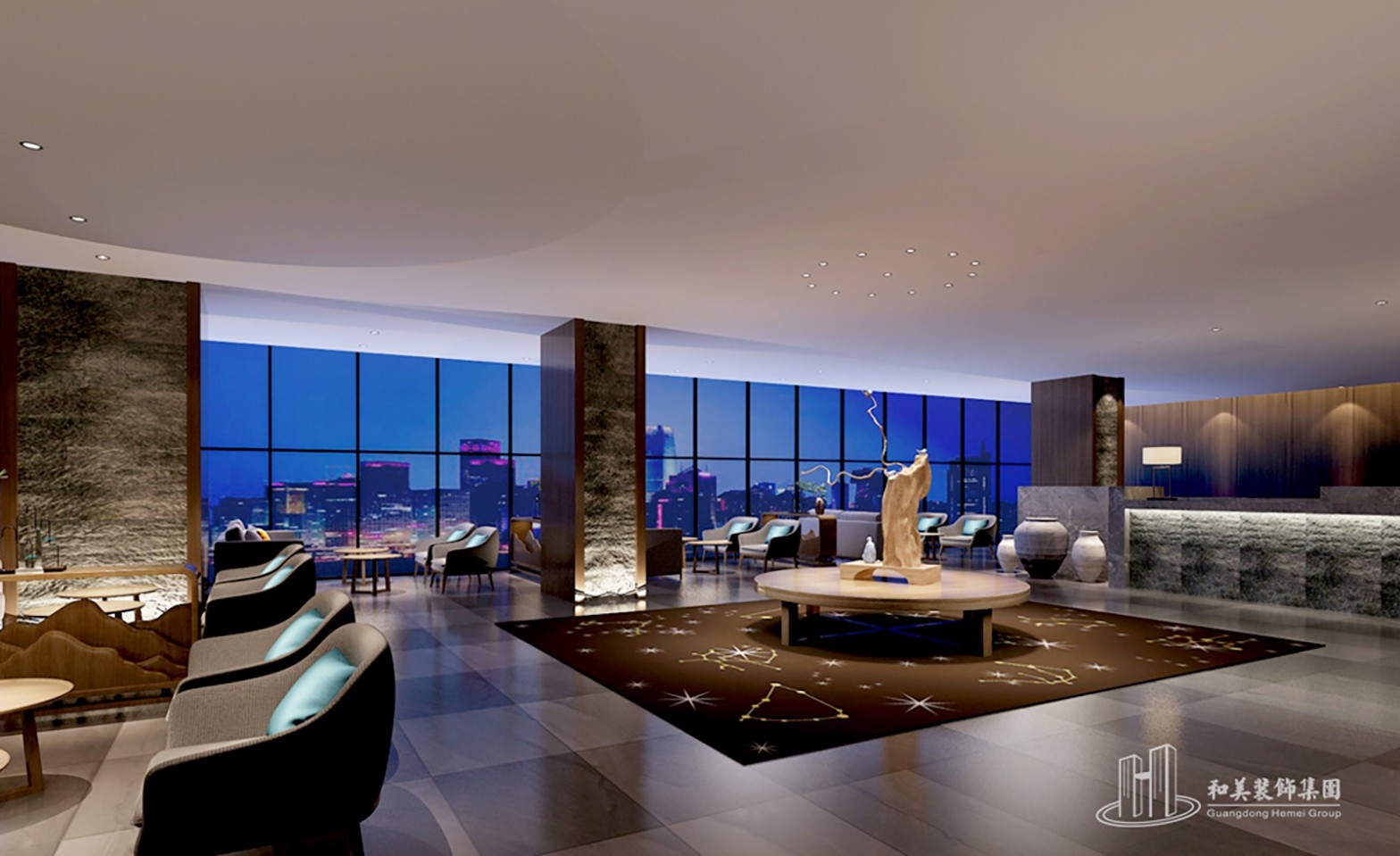 设计理念:本案例结合环境以“观星”为主题风格。在大堂、餐厅、泡浴区、过厅、电梯厅、健身房、客房等区域空间的天花板处或墙面都设计了与星星相关的元素,为旅客构想了一个自然与生活相互渗透的空间。